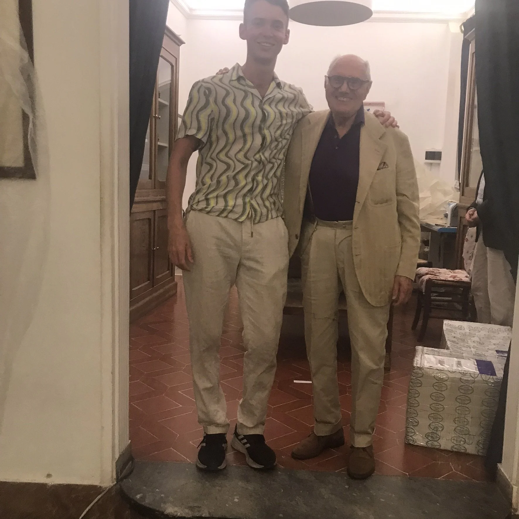 Since we had foolishly neglected to check the opening hours, we apparently arrived just in time for their daily lunch break, and so decided that it indeed was time for lunch which we enjoyed at a nearby café. After we had eaten a few pistachio croissants, drunk a little coffee and played some cards, we returned to enter the sleek boutique where we got great help (and plenty time for ourselves) to sift through the entirety of their tie selection. I had just made my purchase and was inquiring whether they had these elegant dark navy socks in my size, when the owners daughter Valentina (who was helping us), halted for a moment and said “no, I’m sorry… but I think my father is here. Would you like to meet him?”, to which the only sane reply was “Sì!”. And so, we were escorted to snoop about the workshops and to shake hands with Antonio, who greeted us generously, kindly enquired where we were from and even stood for a picture; for which he snatched his jacked- making sure he looked his best. When he was satisfied that we had got a picture, he smiled, turned abruptly and huddled on back into the belly of the beast. This was a definite highlight for me and is sure to live on as the most enthralling experience of our trip.